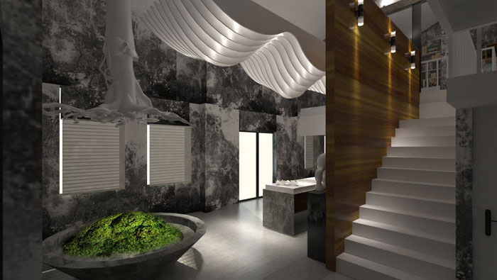 樓梯區(qū)域的設(shè)計(jì),設(shè)計(jì)亮點(diǎn)就是漂浮在空中的樹、與樹根下方的綠地,寓意相互之間的不可分割,隨像樹但卻不是樹,形容空間的亦真亦幻,使人對二樓產(chǎn)生濃厚的興趣。