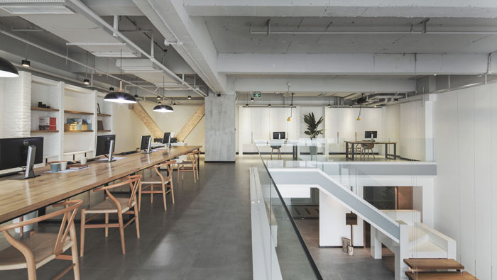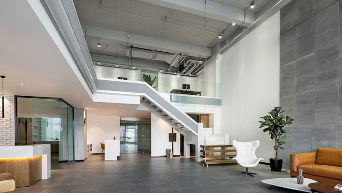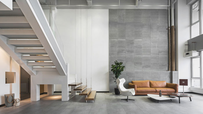 loft風(fēng)格辦公室樓梯的設(shè)計:樓梯本身并不占用空間的面積,在接地的時候設(shè)計師為其制定了專業(yè)的轉(zhuǎn)梯,目的就是希望以設(shè)計的手法,來減輕樓梯對于空間的負(fù)擔(dān),設(shè)計師將過程極簡化,讓樓梯與空間合為一體。