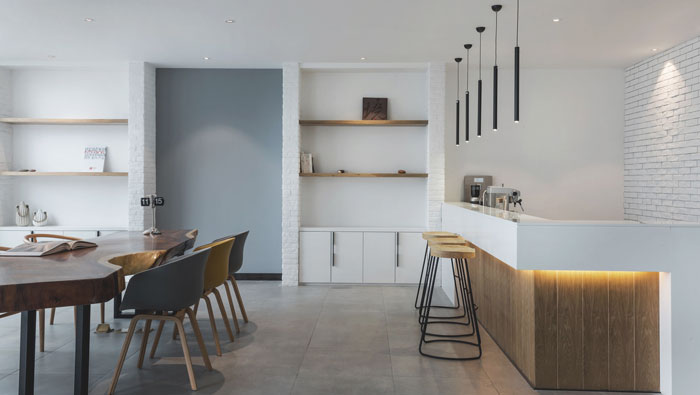 loft風(fēng)格辦公室前臺設(shè)計:前臺是根據(jù)空間的實地情況進(jìn)行的布局設(shè)計,此處位于幾個空間的交匯處,設(shè)計師一方面希望凸顯前臺的屬性,另一方面此處也有返璞歸真的樸素蘊(yùn)含在其中。