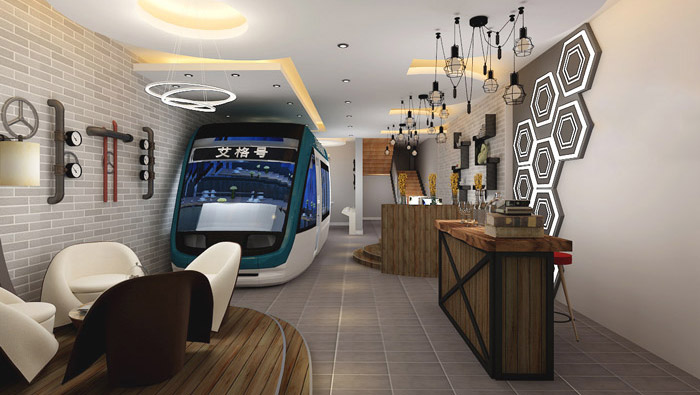 一樓區(qū)域的設(shè)計,設(shè)計師是在一次等待動車的時候來的靈感,看著快速從眼前小時的動車,速度是如此的快速,眨眼間消失在設(shè)計師的眼前,設(shè)計師觀此覺得這與現(xiàn)實的互聯(lián)網(wǎng)一樣,以快速的節(jié)奏發(fā)展,讓人始料未及,設(shè)計師希望通過動車式的設(shè)計讓企業(yè)在以后的發(fā)展中可以乘著快速駛來的車向前飛躍。