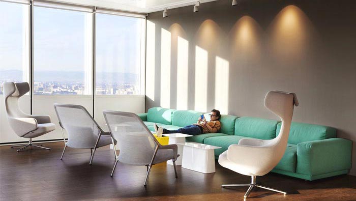 休息區(qū)域的設計:設計師在設計的時候,打破了所有的規(guī)則與制度,希望為員工打造一個完全沒有任何壓力的空間,讓員工在此處可以完全的放松,在此處可以與自己對話,在此處可以感受到生活的美好,以點擊面感受到企業(yè)的關心與愛護,以此提升企業(yè)內部的向心力。