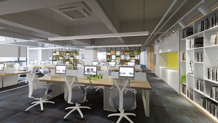 科技公司辦公室辦公區(qū)設(shè)計:整個辦公區(qū)呈開放式分布,在開放的大格局之下,設(shè)計師又制定了相對固定的辦公區(qū)模塊,設(shè)計師希望辦公區(qū)在開放的空間內(nèi)各行其是,避免相互打擾。