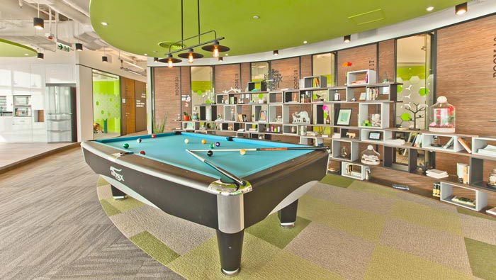 現(xiàn)代簡約辦公室娛樂區(qū)設(shè)計(jì):此處是讓大家從繁忙的工作中解放出來,能放置在室內(nèi)的娛樂項(xiàng)目本身就不多,能放置在辦公室中的娛樂項(xiàng)目更是少之又少,臺球就是一個(gè)不錯(cuò)的選擇,因?yàn)榕_球是一項(xiàng)老少皆宜,適合于各文化層次的既富有消閑性又具有知識性的球類活動(dòng)。