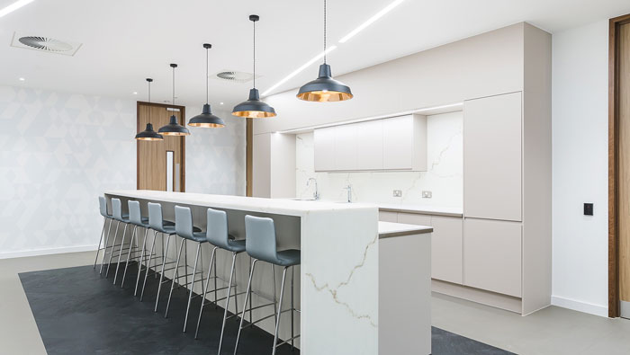 現(xiàn)代簡約辦公室茶水間設(shè)計:在此處給人的感覺就是寧靜,白色讓人焦躁的心情瞬間平靜下來,吧臺讓員工在此處可以稍事休息,喝喝咖啡、吹吹牛,構(gòu)筑一幅和諧的畫面。