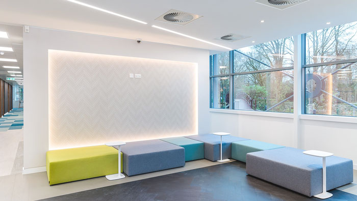 現(xiàn)代簡約辦公室接待區(qū)設(shè)計:去前臺的設(shè)計模式是為了拉近客戶與企業(yè)的距離,這也是設(shè)計師考慮空間的實際情況而決定的,休息區(qū)是為了讓客戶進入企業(yè)后,感受到企業(yè)待人接物的企業(yè)理念。