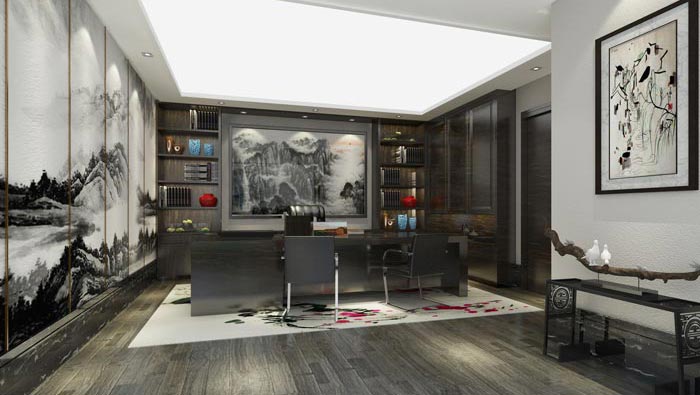 ? 總經(jīng)理辦公室的設(shè)計:此處融合了壁紙畫、墻畫、禪意、中式家具與一體,壁紙畫給空間一種蓬勃的氣勢,此氣勢與總經(jīng)理自身的氣勢相互融合在一起,有一種促進(jìn)的作用,讓總經(jīng)理的氣勢有山的高山遠(yuǎn)矚、有水的上善若水,墻畫、禪意、中式家具的合成是對總經(jīng)理心境的提煉,不斷感悟人與自然的關(guān)系,這樣對于總經(jīng)理的眼界與心胸都有很大的提升。