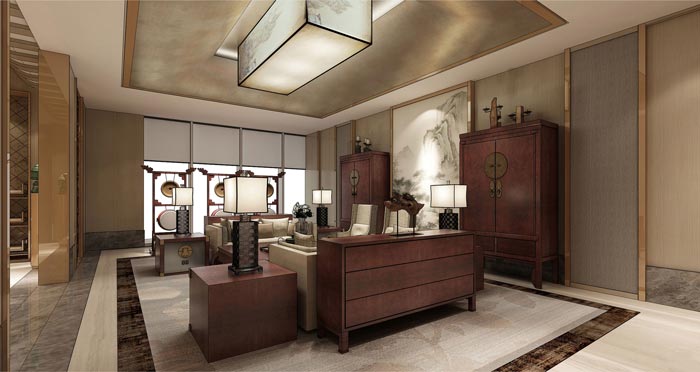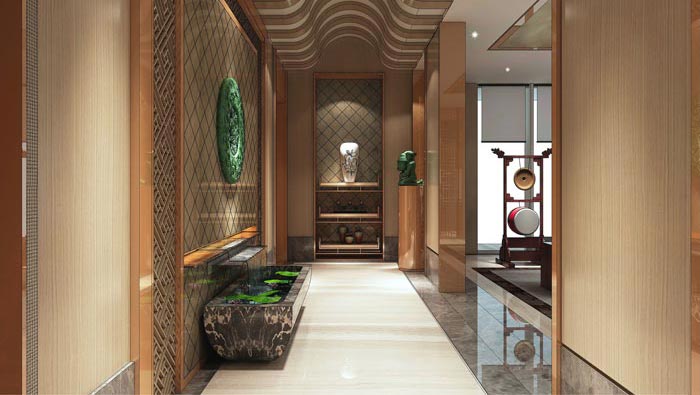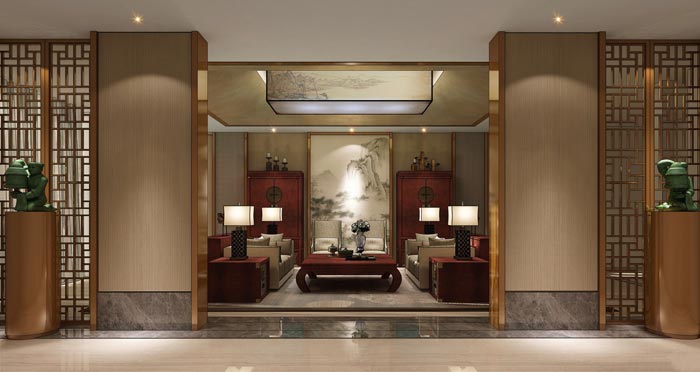 接待區(qū)域進(jìn)門區(qū)的設(shè)計:此處是接待區(qū)域與進(jìn)門區(qū)域的連接處,進(jìn)門區(qū)域通過一個轉(zhuǎn)彎就可達(dá)到此處,門的設(shè)計也非常有講究,要開多大、要有多高都有其特殊的寓意,透過門看進(jìn)室內(nèi)首先映入眼簾的就是山水畫,此畫極注重象外之意,其中含義既含情又寓理,給人以畫外聯(lián)想,其次就是多元化的中式家具,賦予空間不同的審美。