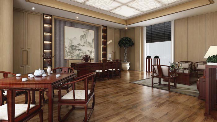 總經(jīng)理辦公室的設(shè)計:此處重點在于展現(xiàn)人與空間、物與空間、空間與自然之間的關(guān)系,其中中式后現(xiàn)代家具以其優(yōu)美的線條,多變的曲線,靈秀的圖案,點到為止的制作技藝,在加上符合現(xiàn)代人需求的時尚元素和個性化,令審美視線不斷跳躍,古樸和時尚融為一體。