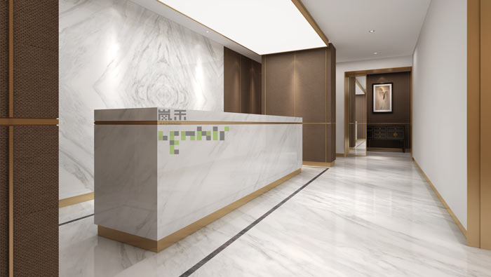 新中式辦公室前臺設計:電梯間與前臺一脈相承,唯一不同的就是色彩的不同,電梯間色彩稍輕、前臺的色彩稍重,色彩之間的變化是為了區(qū)分兩者之間的關系。