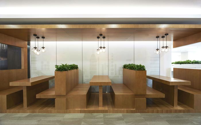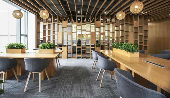 汽車租賃公司辦公室辦公區(qū)設計:共享交流及臨時辦公區(qū),暖色木質(zhì)家具及木格柵,界定出鮮明空間范圍的同時,溫暖的燈飾營造出輕松的交流環(huán)境,讓身心可以在此得到放松。