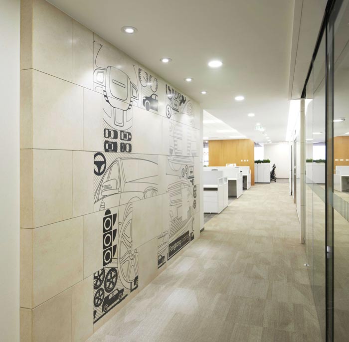 汽車租賃公司辦公室過道設計:山峰、坦途、汽車、構(gòu)件等相關(guān)元素巧妙與空間特征相結(jié)合,利用鮮明的色彩和抽象的形制,完美結(jié)合功能需要的同時,成為了企業(yè)展示最直觀的傳達。