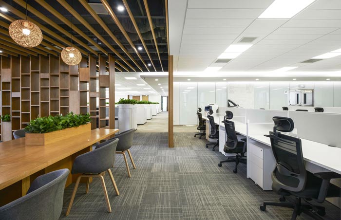 汽車租賃公司辦公室辦公區(qū)設計:開放辦公區(qū)遵循簡潔、高效的設計策略,大面積白色的工位配合點簇綠植,再結(jié)合不同分區(qū)間綠植墻的設置,使整體空間充滿了自然、清新、陽光的味道。