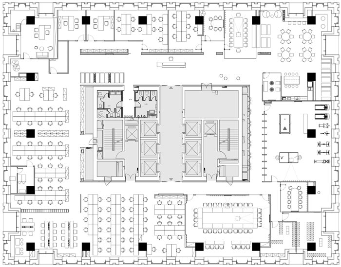 汽車租賃公司辦公室設計平面圖:通過上圖可以看出,企業(yè)對于辦公工位的需求十分大,設計師將辦公工位安置在空間的四周,共享空間被安置在中心區(qū)域,有四周圍繞中央,中央俯視四周的意味。