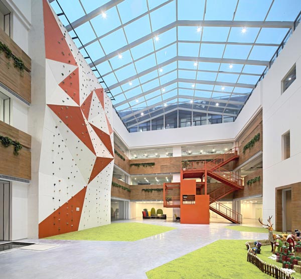 大廳的設(shè)計:設(shè)計師在設(shè)計的時候,保留了建筑本身的優(yōu)點,攀巖的裝飾物給人一種勇于挑戰(zhàn)的動力,兩旁的草坪給人一種鳥語花香的世外氣息。