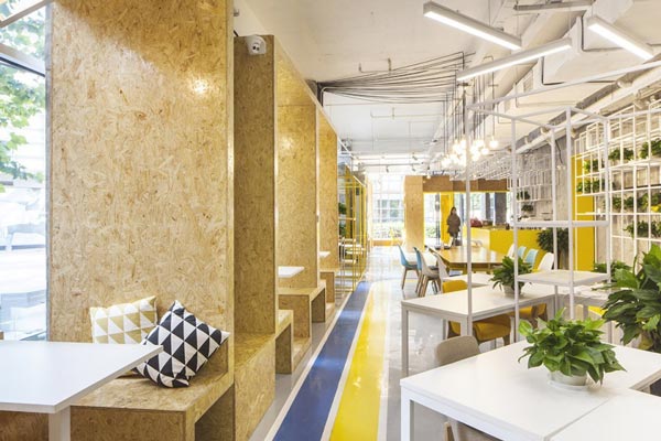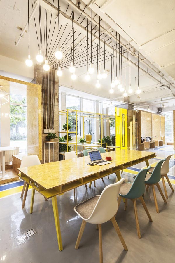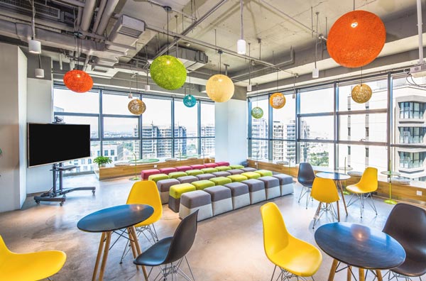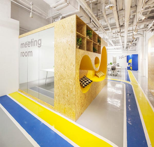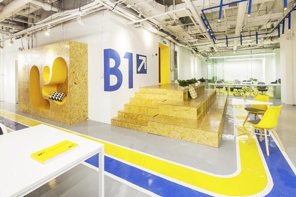交流區(qū)域的設(shè)計:設(shè)計師在設(shè)計的時候,大膽的采用黃色、白色、藍(lán)色三色結(jié)合的元素設(shè)計,白色是百搭色、黃色與所有色彩有很強的親和力、藍(lán)色是天空的顏色,空中包含著白色與黃色,顯示出企業(yè)包容的內(nèi)涵。
