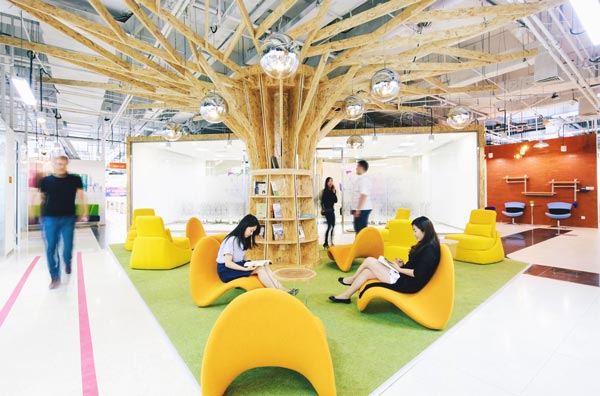 閱讀區(qū)域的設(shè)計:設(shè)計師在設(shè)計的時候,在中心安置了一個樹狀模型,此模型本身是樹的形狀,為空間帶來了自然的屬性,其中分不了收納空間,周圍分不了休息場所,讓員工在此處學(xué)習(xí)、休息、歸零。