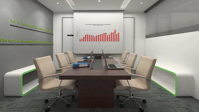 會(huì)議室的設(shè)計(jì),設(shè)計(jì)師在設(shè)計(jì)的時(shí)候,將會(huì)議桌安置在中心區(qū)域,這樣在保證基本的需求之外,還可以使動(dòng)線分布在兩端加大空間的活動(dòng)空間,同時(shí)在不影響空間功能的前提下,設(shè)計(jì)師利用軟裝來(lái)增加空間的承載能力。