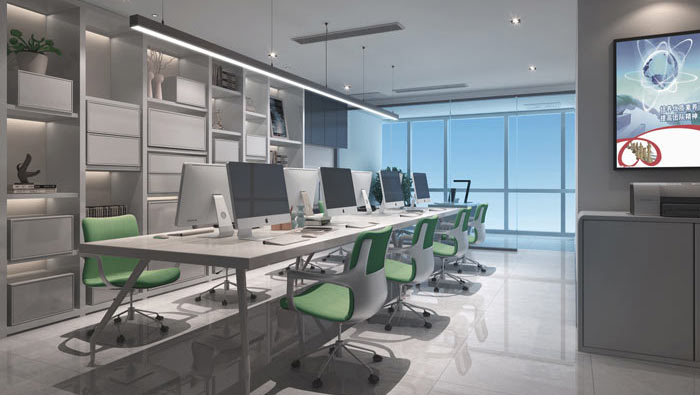 前臺(tái)空間的設(shè)計(jì):設(shè)計(jì)師在設(shè)計(jì)的時(shí)候,大量使用了純白色燈帶,加之其立體造型,力求將整體科技、前衛(wèi)的風(fēng)格滲透于整個(gè)空間,再搭配綠色的點(diǎn)綴,整個(gè)公司生機(jī)勃勃的發(fā)展之勢(shì)躍然而出。