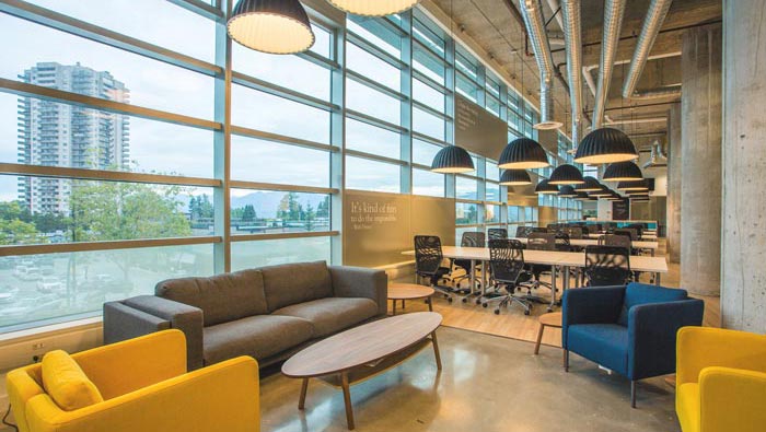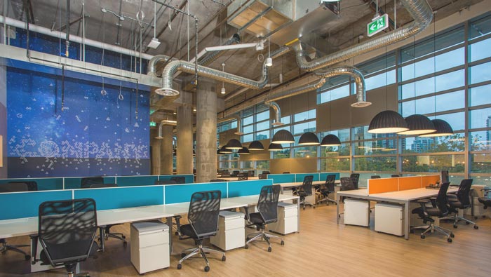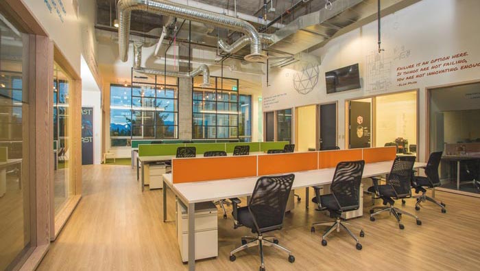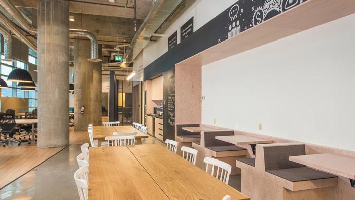 開放式辦公室區(qū)域的設(shè)計:此處的設(shè)計也是與以往不同,此處主要是滿足小型創(chuàng)業(yè)公司的場地需求,因為對于創(chuàng)業(yè)者來說一般人數(shù)不多、而且預(yù)算有限,故此設(shè)計師將其安置在一個大型的空間之中,一方面降低企業(yè)的創(chuàng)業(yè)成本,另一方面也為創(chuàng)業(yè)公司與創(chuàng)業(yè)公司之間的相互關(guān)聯(lián)創(chuàng)造契機(jī)。