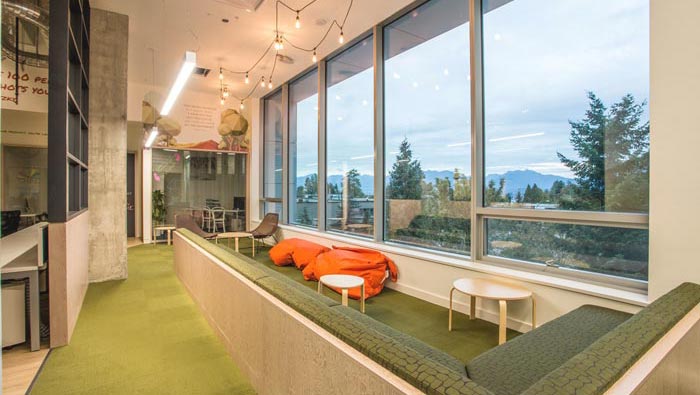 右側(cè)休息區(qū)域的設(shè)計:這是位于右側(cè)的其中一個休息區(qū)域,設(shè)計師在設(shè)計的時候,都是采用相對取景的設(shè)計手法,將內(nèi)外結(jié)合在一起,設(shè)計師這樣的設(shè)計就是為了體現(xiàn)聯(lián)合辦公空間的魅力,讓入駐的企業(yè)可以以最小的預(yù)算體驗到最人性化的辦公空間。