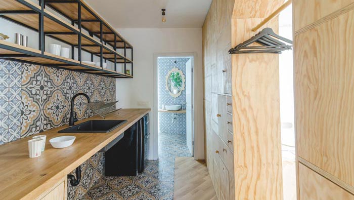 茶水間的設(shè)計(jì):此處位于一個(gè)獨(dú)立的空間之中,設(shè)計(jì)師在設(shè)計(jì)中借用了廚房的設(shè)計(jì)模式,咋一看就是一個(gè)廚房,但是仔細(xì)觀察后會(huì)發(fā)現(xiàn),設(shè)計(jì)師將整個(gè)空間開(kāi)發(fā)到極致,茶水臺(tái)上方的放置臺(tái)、后方的儲(chǔ)藏柜、儲(chǔ)藏柜中間的內(nèi)置衣架,從儲(chǔ)藏到收納應(yīng)有盡有,可以感受到設(shè)計(jì)師對(duì)于生活的態(tài)度。