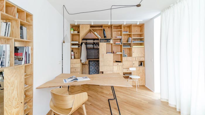 閱讀區(qū)域的設(shè)計(jì):此處是兩個(gè)承重墻中間的區(qū)域,設(shè)計(jì)師為其量身定做了書(shū)架,在尺寸的把握上也相當(dāng)?shù)轿唬瑫r(shí)在右上方設(shè)計(jì)師突發(fā)奇想的留下了一個(gè)缺口,設(shè)計(jì)師的原意是完全契合,但是在設(shè)計(jì)當(dāng)中發(fā)現(xiàn)四四方方的設(shè)計(jì)與空間有一點(diǎn)格格不入,有點(diǎn)太嚴(yán)肅了,一個(gè)缺角的變化讓此處有了一絲調(diào)皮。