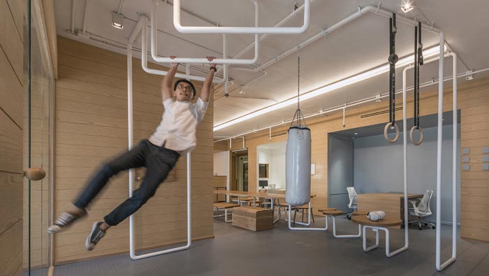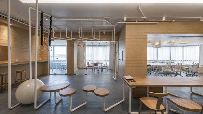 IT公司辦公室單杠區(qū)設(shè)計:此處主要是員工活動、健身的區(qū)域,這也是此次辦公室設(shè)計的一大亮點,設(shè)計師將健身巧妙的融入空間,當(dāng)員工勞累的時候,可以來這樣鍛煉一下,一來強身健體,二來打破心中憂郁。