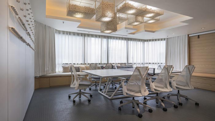 IT公司辦公室會議休息區(qū)設(shè)計:會議室與休息區(qū)域相互融合在一起,表達了設(shè)計師勞逸結(jié)合的設(shè)計理念,問題的解決往往不是一次會議就可以解決的,而有效的休息正是彼此相互交流的最佳時機。