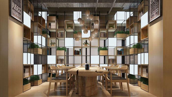 休閑區(qū)域的設計,設計師以原木框架做為支柱,以軟裝、綠植做為搭配,將咖啡廳的設計原則引入其中,這樣的空間更能承擔起休閑的作用。