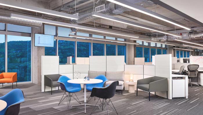 辦公區(qū)域的設(shè)計:此處的設(shè)計是位于回型設(shè)計的外圍,這樣設(shè)計的好處就是與落地窗相鄰,可以為員工創(chuàng)造優(yōu)質(zhì)的辦公氛圍,陽光可以自然的投射到空間之中,外部自然景觀也可以在一定程度上影響員工的心境,開放兼顧封閉的辦公設(shè)計,讓員工在開放之間擁有自己的個人活動范圍,充分體現(xiàn)了以人為本的設(shè)計原則。