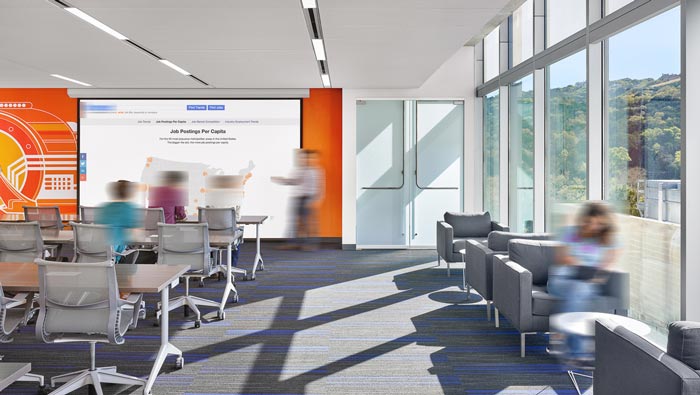 培訓(xùn)區(qū)域的設(shè)計:設(shè)計師在設(shè)計的時候,了解到企業(yè)內(nèi)部部門與部門之前是相互合作的關(guān)系,每一個部門負(fù)責(zé)一個版塊,因為企業(yè)的產(chǎn)品主要戰(zhàn)場在互聯(lián)網(wǎng)之上,故此更加強(qiáng)調(diào)相互之間的合作與協(xié)調(diào),大投影儀就是讓每一個部門對自己的業(yè)務(wù)了解的更加清楚,并對整體有一個大致的感官了解,以此促進(jìn)內(nèi)部的發(fā)展與協(xié)作。