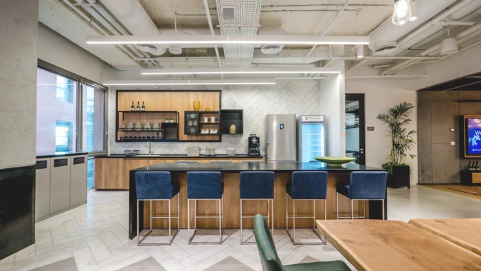 茶水間的設計:設計師在設計的時候,將其安置在靠窗的空間之中,在空間的設計上設計師采用咖啡廳的設計手法,設計師主要是希望營造咖啡廳式的空間氛圍,讓員工在此處可以遠離工作的壓力,讓自身融入溫馨的空間之中,讓員工可以在此處休息、思考、歸零。