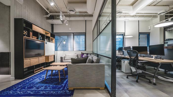 辦公區(qū)域的設計:此次是一個獨立部門的辦公空間,在這里設計師考慮到部門的特殊性,故此將空間利用隔斷一分為二,交流區(qū)域、匯報區(qū)域合成一處,這樣的設計不僅提升了辦公的效率,而且在員工勞累的時候,此處也可轉化為休息區(qū)域,讓員工在這里休息。