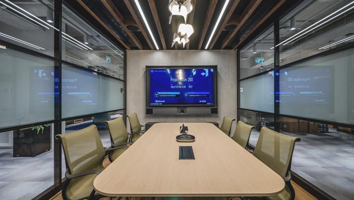 匯報區(qū)域的設計:此處主要為匯報工作之用,周圍設計師利用隔斷將其進行分離,目的就是為了不受影響,但同時透明玻璃也為空間提供了足夠的自然光,大液晶屏幕掛在空間的前方,一切都清清楚楚,設計師的目的就是希望匯報可以順順利利。