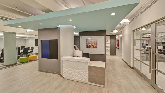 交流區(qū)域的設(shè)計(jì):設(shè)計(jì)師在設(shè)計(jì)的時(shí)候,將其安置在辦公空間的前端,此處是設(shè)計(jì)師預(yù)留的大型開放式辦公空間,設(shè)計(jì)師為了有效的將空間與辦公空間進(jìn)行分離,采用了有色的地毯與頂部的造型設(shè)計(jì)來(lái)進(jìn)行有效的區(qū)分,雖然在個(gè)體上看著是分離了,但是在整體上它卻為整個(gè)空間的結(jié)合起到很大的粘合作用。