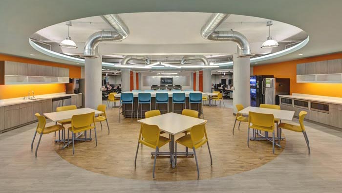 茶水間的設(shè)計(jì):設(shè)計(jì)師在設(shè)計(jì)的時(shí)候,將其安置在一個(gè)獨(dú)立的空間之中,整個(gè)空間采用圓形進(jìn)行設(shè)計(jì),在圓形的外部采用六角形進(jìn)行分布,以此造型為基礎(chǔ)增加空間的容納能力,設(shè)計(jì)師希望讓員工在此處交流、休息、玩耍、娛樂,不斷進(jìn)步、不斷成長(zhǎng)。