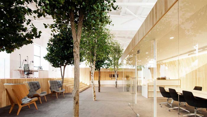童裝公司辦公室進(jìn)門區(qū)設(shè)計(jì):進(jìn)入空間后首先看到的就是一排排樹木向內(nèi)延伸,這樣的設(shè)計(jì)讓人眼前一亮,空間的空氣也格外清新,讓人完全感受不到這是在是室內(nèi),設(shè)計(jì)師希望在客戶心中留下不錯(cuò)的第一印象。