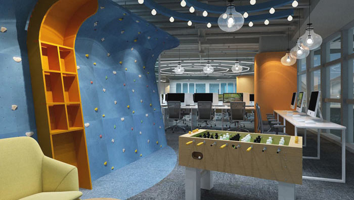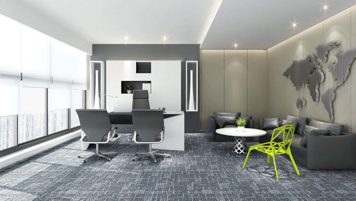 辦公區(qū)域的設(shè)計(jì):設(shè)計(jì)師在設(shè)計(jì)的時(shí)候,為了是空間顯得更加搭配,故此設(shè)計(jì)師在地毯上采用了小小的創(chuàng)意,一個(gè)個(gè)長(zhǎng)方形的圖案在地毯上凸顯,將辦公工位安置在其中,以此與空間其他區(qū)域進(jìn)行有效的區(qū)分,同時(shí)燈光采用圓形向外擴(kuò)張的方式,一方面為辦公空間帶來(lái)了極好的照明,同時(shí)表達(dá)自里向外的思維擴(kuò)張方式。