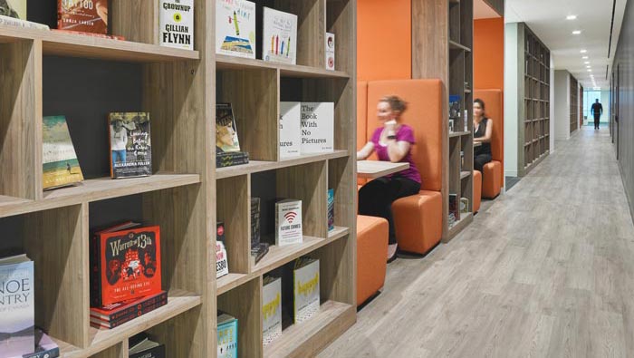 過(guò)道閱讀區(qū)域的設(shè)計(jì):設(shè)計(jì)師在設(shè)計(jì)的時(shí)候,在過(guò)道靠近閱讀區(qū)域的一側(cè)利用隔斷柜做為墻體,將其與墻體合二為一,閱讀區(qū)域是開(kāi)放式的,但是設(shè)計(jì)師希望通過(guò)硬裝與軟裝的結(jié)合提升空間的容納能力,即展示了企業(yè)的產(chǎn)品,又方便了客戶對(duì)于書(shū)籍的需求,讓書(shū)籍更加貼切客戶,讓他們支架不分彼此。