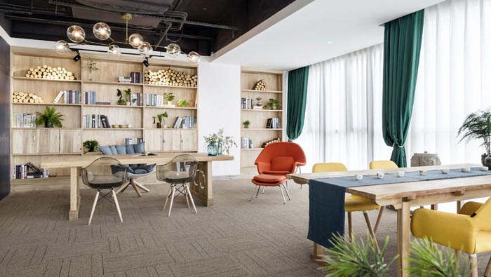 環(huán)保公司辦公室左側(cè)設(shè)計(jì):前臺(tái)位于空間的中央,往左走看到的有樹木、綠竹與燈光組成的開放式辦公空間,三者相互結(jié)合在一起,無形中增加了空間幽深之感,在點(diǎn)綴空間的同時(shí),也加深了空間的視覺感受。