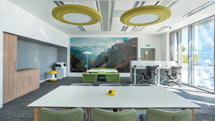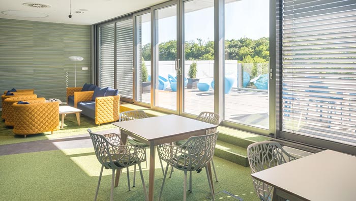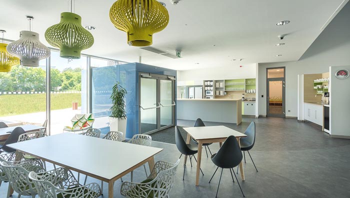 茶水間的設(shè)計(jì):此處正對(duì)外界的草坪,陽光也明媚、充足,設(shè)計(jì)師希望給員工一個(gè)多功能的休息區(qū)域,既可以在室內(nèi)品嘗咖啡,又可以在草坪上玩耍,設(shè)計(jì)師希望室內(nèi)與室外之間的間隔,可以在這里打破,讓員工在辦公的中途,也可以接觸到外界的世界。