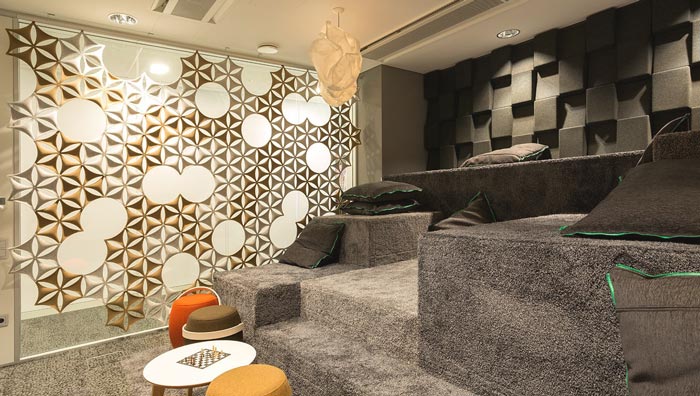 休息區(qū)域的設(shè)計(jì):當(dāng)員工勞累的時(shí)候,可以三五成群的在這里休息、聊天、玩鬧,在這里沒有任何束縛可言,設(shè)計(jì)師希望在這里讓員工感受到的是自由與輕松,在設(shè)計(jì)師看來技術(shù)型人才,在更多的時(shí)候需要的是自由,也只有這樣才能排解心中的壓抑。