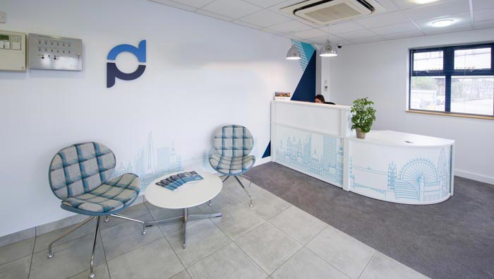 科技公司辦公室前臺設(shè)計:設(shè)計師在設(shè)計的時候,將前臺設(shè)置在空間的一個角落,在設(shè)計師看來這樣的設(shè)計可以讓客戶進(jìn)入后有一個緩沖時間,以此為下一步的合作與交流提供良好的基礎(chǔ)。
