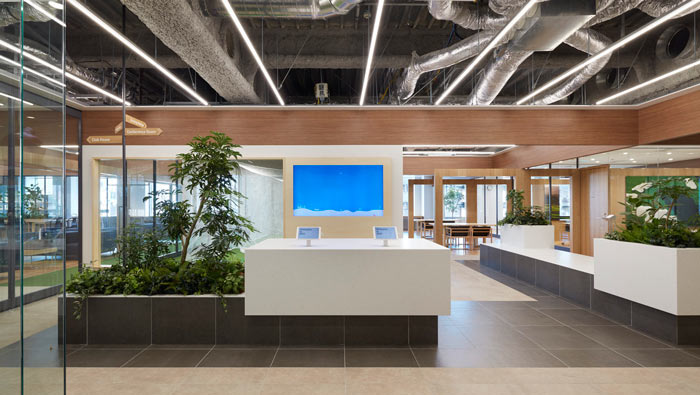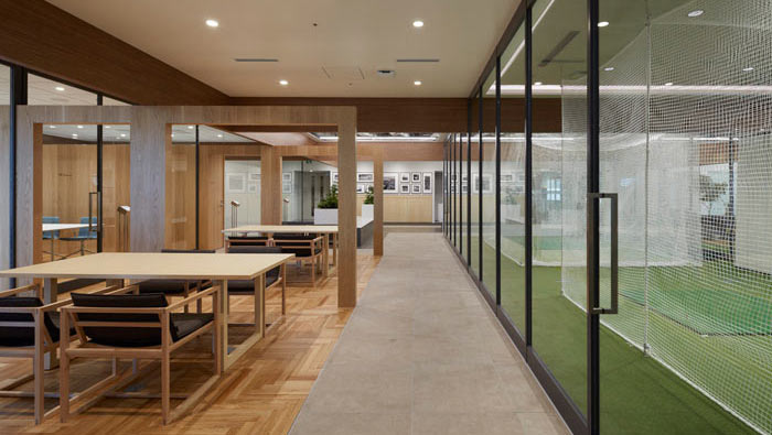 國際貿(mào)易公司辦公室過道設(shè)計:在會議室與休息區(qū)域之間,設(shè)計師也預留了過道,過道好似木橋,將內(nèi)、外空間連接在一起,設(shè)計師希望用不同的設(shè)計手法點綴空間。