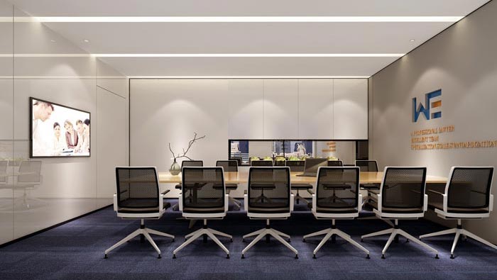 會議室的設(shè)計,設(shè)計師在設(shè)計的時候,將會議桌安置在空間的中心區(qū)域,一方面利于會議的開展,因為電視局限了空間的某種屬性,另一方面這樣的設(shè)計釋放了空間的動線,不會受到空間局限。