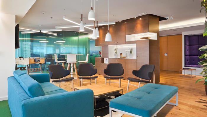 辦公區(qū)域的設(shè)計(jì):設(shè)計(jì)師在設(shè)計(jì)的時候,采用不規(guī)則的辦公布局,在設(shè)計(jì)師看來這樣的設(shè)計(jì)可以各取所長、各補(bǔ)所短,在開放空間布局的同時,為每一個員工打造一個屬于自己的私人空間,不規(guī)則所打造的辦公空間,讓空間充滿了活力。