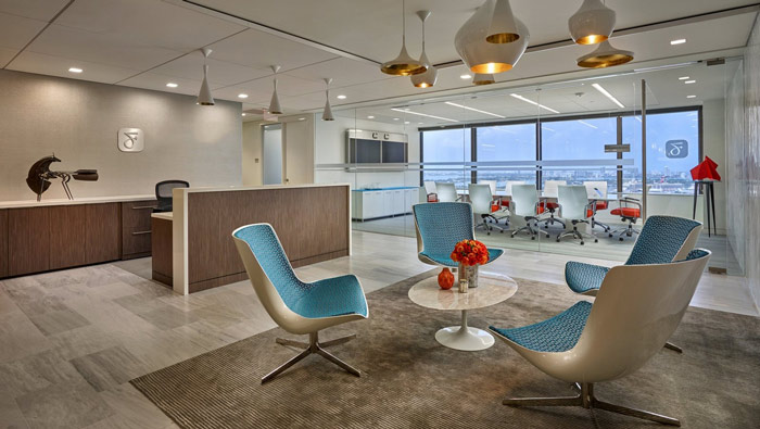 辦公室辦公區(qū)域設計:律師的日常工作是十分繁雜的,所以一個獨立的辦公場所也是必須的,設計師沒有將辦公區(qū)域安置在一起,而是有效的加以分離,讓相互之間不會受到打擾,坐與站的感受截然不同。