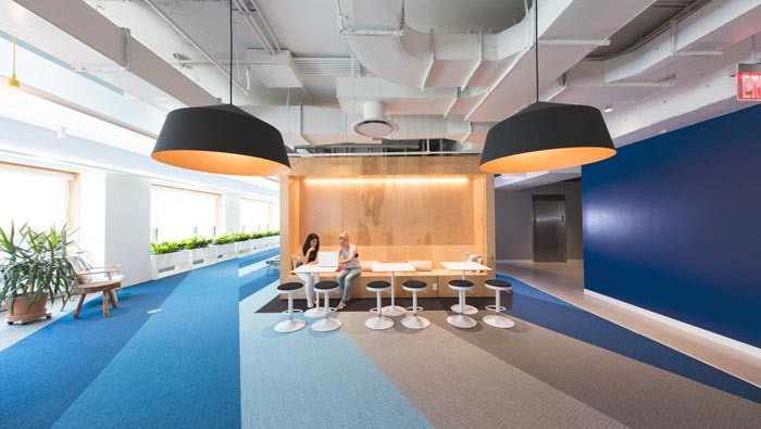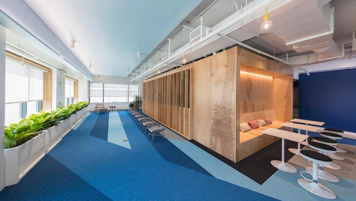 網(wǎng)絡(luò)公司辦公室動線設(shè)計:設(shè)計師在設(shè)計的時候,考慮到此處空間地處空間的內(nèi)側(cè),故此讓光源可以投入此處空間之中,動線的設(shè)計也采用不同的色彩進(jìn)行表現(xiàn),設(shè)計師希望通過這樣的設(shè)計增加空間的通暢與方便。