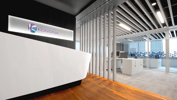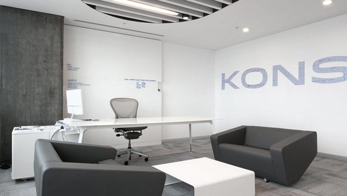 進門區(qū)域的設(shè)計:設(shè)計師在設(shè)計的時候,結(jié)合空間的實際情況,最后決定采用去前臺的設(shè)計手法,這樣一來一方面可以進一步深化辦公流程,另一方面也可以彌補空間的不足,流線型的白色造型加上白色logo墻與彩色logo,也為企業(yè)帶來了一絲靈動或活力。