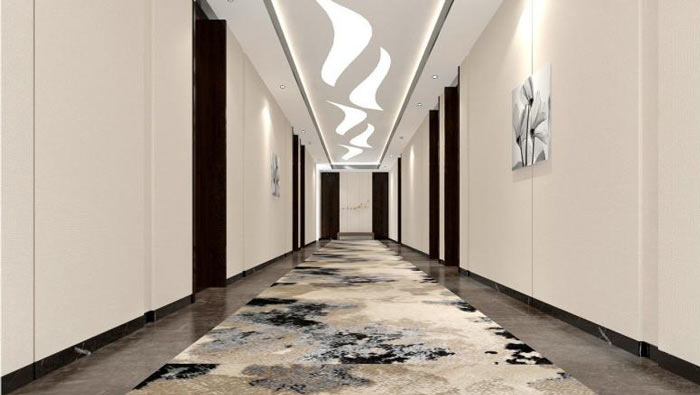 政府辦公室走廊裝修:墻面以素色墻紙、或者白乳膠漆為主,并搭配深色踢腳線使空間層次分明,頂面采用變形燈光片設(shè)計(jì)。